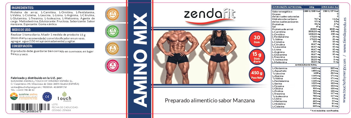 Contiene: L-Carnitina, L-Ornitina, L-Fenilalanina, L-Valina, L-Cisteína, L-Leucina, L-Lisina, L-Arginina, L-Citrulina, L-Glutamina, L-Treonina, L-Isoleucina, L-Metionina y proteína de arroz.