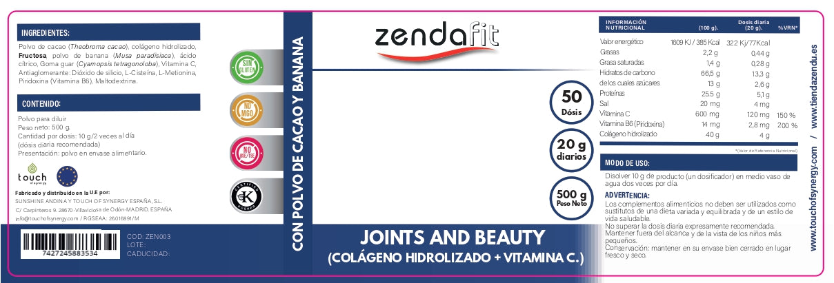 Contiene: Colágeno hidrolizado bovino, Polvo de Mango y de Banana, Vitamina C, Piridoxina (Vitamina B6) y MSM (Metilsulfonilmetano).