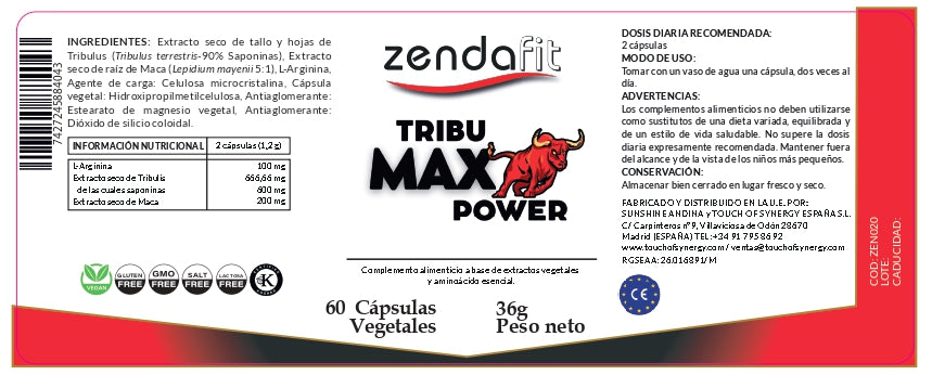 Extracto seco de Tribulus (tribulus terrestris) 90% Saponinas, Extracto seco de Raíz de Maca (Lepidium meyenii) y L-Arginina.